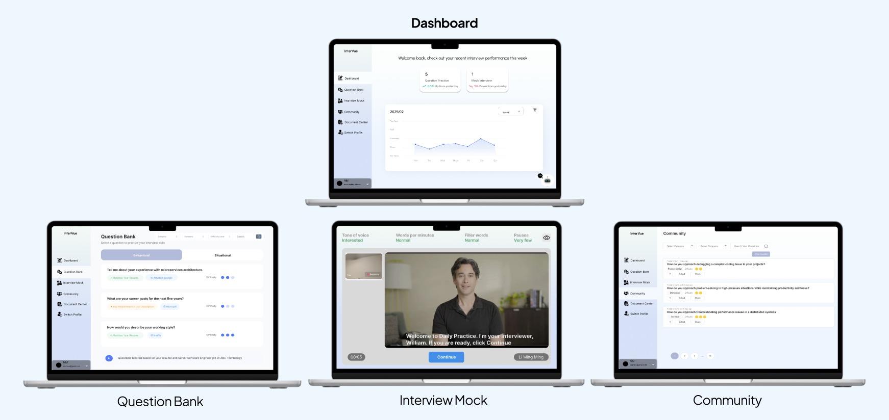 Many qualified job seekers underperform in interviews not due to a lack of experience, but due to weak self-expression, unclear storytelling, or unfamiliarity with behavioral interview formats. Generic preparation resources fail to adapt to individual contexts or job descriptions. InterVue addresses this gap by turning interview prep into an interactive, structured experience driven by users’ real experiences and target roles.
