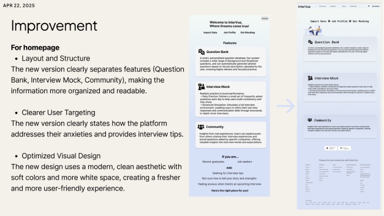 Many qualified job seekers underperform in interviews not due to a lack of experience, but due to weak self-expression, unclear storytelling, or unfamiliarity with behavioral interview formats. Generic preparation resources fail to adapt to individual contexts or job descriptions. InterVue addresses this gap by turning interview prep into an interactive, structured experience driven by users’ real experiences and target roles.